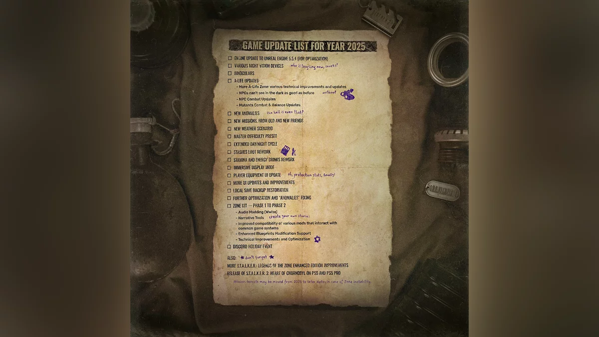 В начале августа компания GSC Game World опубликовала дорожную карту поддержки S.T.A.L.K.E.R. 2 на вторую половину 2025 года. Согласно ей, в ближайшие месяцы разработчики переведут игру на движок Unreal Engine 5.5.4, добавят бинокль, новые задания, аномалии, уровень сложности «Мастер» и новый тип погоды, улучшат оптимизацию, доработают систему A-Life и не только.